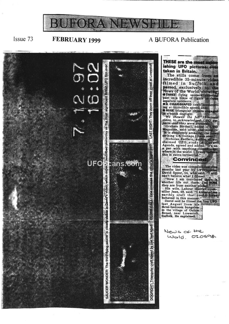 This document is a compilation of press clippings and articles, primarily from 1997-1999, concerning UFO sightings in the United Kingdom and the broader discourse surrounding UAP research. It features reports from various witnesses, including motorists and residents, who describe observing unusual aerial objects, such as triangular and cigar-shaped craft. The document highlights the activities of organizations like BUFORA and the British UFO Studies Centre, which collect and investigate these reports. A significant portion of the text is dedicated to the scientific perspective on UFOs, referencing the work of researchers like Jacques Vallee, J. Allen Hynek, and Dr. Peter Sturrock. The document notes that while the scientific community has historically been skeptical, there are ongoing efforts to treat the subject with academic rigor, including a review by the Society for Scientific Exploration. Additionally, the document touches upon the cultural impact of UFOs, mentioning the influence of media like 'The X-Files' and the public's fascination with the topic. It also includes an obituary for Athelstan Spilhaus, an engineer involved in early atmospheric research and the Roswell incident. Overall, the document serves as a snapshot of late 20th-century British ufology, reflecting a mix of anecdotal sighting reports, public interest, and the evolving scientific debate regarding the nature of unidentified aerial phenomena.
