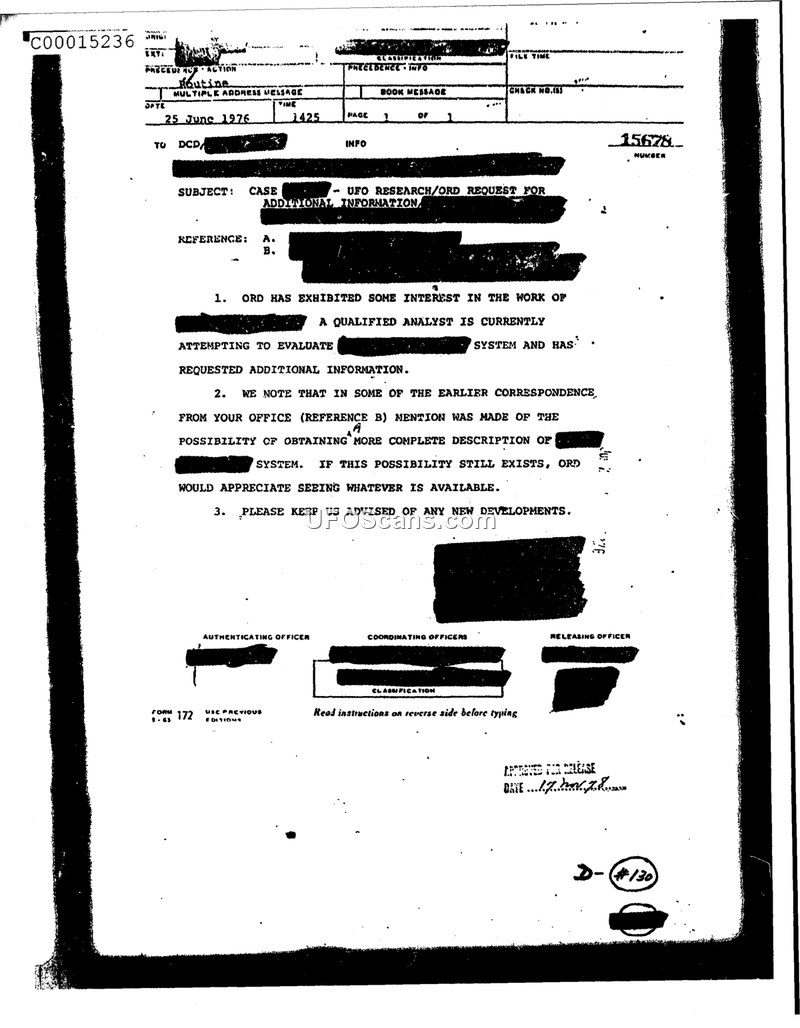 A 1976 internal communication requesting additional information from the DCD regarding a system under evaluation by the Office of Research and Development (ORD) in relation to a UFO research case.