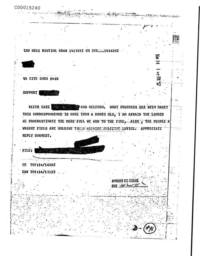 An urgent 1957 memo requesting a status update on a delayed case, noting that personnel at Wright Field are awaiting instructions.