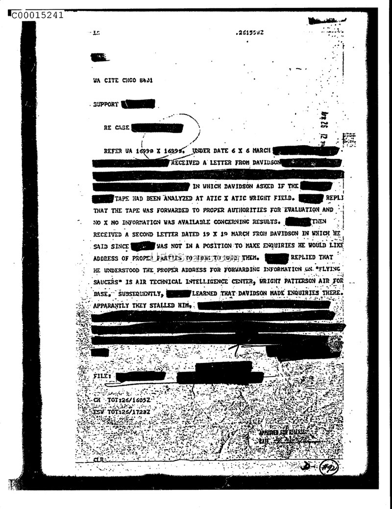 This document records an inquiry by an individual named Davidson regarding the analysis of a tape by the Air Technical Intelligence Center. It notes that Davidson was directed to the center at Wright Patterson Air Force Base, where he was reportedly stalled in his efforts to obtain information.