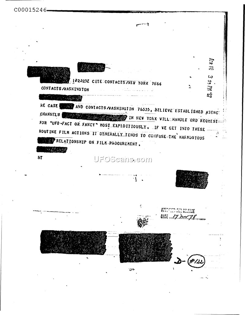 This document is a declassified communication, likely a teletype or cable, concerning the administrative handling of film procurement for a project identified as 'UFO-Fact or Fancy.' The text references communications between 'CONTACTS/NEW YORK' and 'CONTACTS/WASHINGTON.' The primary intent of the message is to ensure that requests related to this project are handled expeditiously through established agency channels. The author expresses concern that involving these requests in routine film actions tends to cause confusion and negatively impacts the 'harmonious relationship on film procurement.' The document bears a stamp indicating it was approved for release on November 17, 1978.