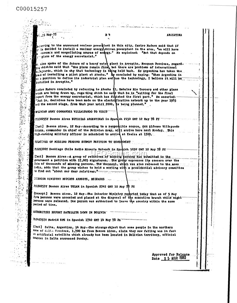 This document is a compilation of news reports from Argentina dated 15 May 1978. It covers several distinct topics. First, it details statements by Castro Madero regarding Argentina's nuclear energy plans, specifically mentioning a powerplant in the city, a heavy water plant in Arroyito, Neuquen Province, and the status of Atucha II and Embalse Rio Tercero. Second, it reports on the upcoming visit of the Bolivian Army commander, General Alfonso Villalpando, to Buenos Aires. Third, it notes that a group of relatives of missing persons submitted a petition with 17,005 signatures to the government, requesting a meeting with a presidential advisory committee. Fourth, it reports that the Interior Ministry announced the arrest of five people and the release of eight others as of 5 May. Finally, the document reports that a strange object observed falling in the northern zone of Salta Province, Argentina, was identified by official sources as an artificial satellite that had landed in Bolivian territory.