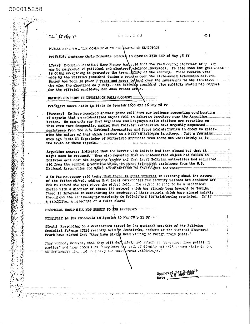 This document is a compilation of press reports dated 17 May 1978, detailing political and anomalous events in Bolivia. The first section reports on statements made by Bolivian President Hugo Banzer regarding the upcoming 9 July elections, noting his support for General Juan Pereda Asbun and his efforts to maintain national tranquility. The second section, titled 'Reports Conflict on Details of Fallen Object,' outlines a series of reports concerning an unidentified object that allegedly crashed in Bolivian territory near the Argentine border. According to the text, local authorities requested assistance from the U.S. National Aeronautics and Space Administration (NASA) to investigate the incident. Reports from La Paz indicate that the area where the object fell was cordoned off, and the object, described as a mechanical device with a diameter of nearly 14 meters, was transported to Tarija. The document notes that there is significant public interest in determining whether the object is a satellite, a meteorite, or a false alarm. The final section discusses the National Electoral Court's response to declarations from the Bolivian Socialist Felange (FSB), asserting that the court members would not submit to political pressure.