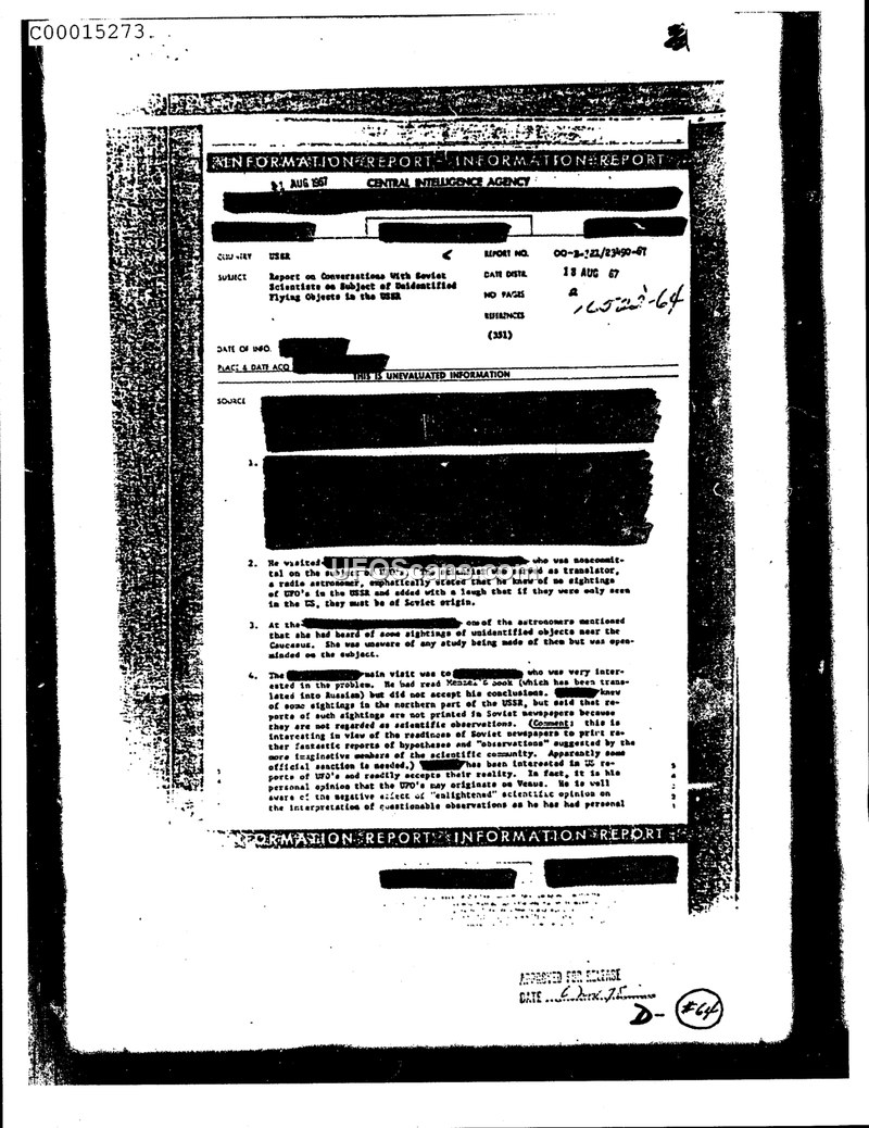 This Central Intelligence Agency information report, dated August 18, 1967, details conversations held with Soviet scientists regarding the subject of Unidentified Flying Objects (UFOs) within the USSR. The document outlines the general skepticism and lack of official interest in the phenomenon within the Soviet scientific community. One scientist, a radio astronomer, remained non-committal and jokingly suggested that if UFOs were only seen in the United States, they must be of Soviet origin. Another astronomer mentioned hearing of sightings near the Caucasus but noted that she was unaware of any formal studies being conducted. The report highlights that sightings are not typically printed in Soviet newspapers because they are not regarded as scientific observations. The document notes that while some Soviet scientists have read Western literature on the subject, such as the book by Menzel, they do not necessarily accept the conclusions presented. Furthermore, the report mentions that some individuals within the scientific community may hold personal opinions, such as the possibility that UFOs originate from Venus, but these views are distinct from official scientific consensus.