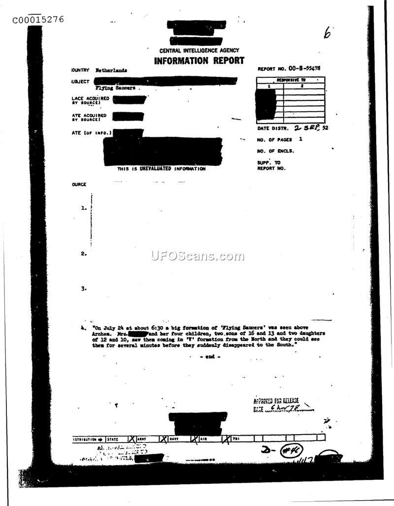 A CIA report detailing a July 24 sighting of 22 'Flying Saucers' in a 'V' formation over Arnhem, Netherlands. The objects were observed by a woman and her four children for several minutes.