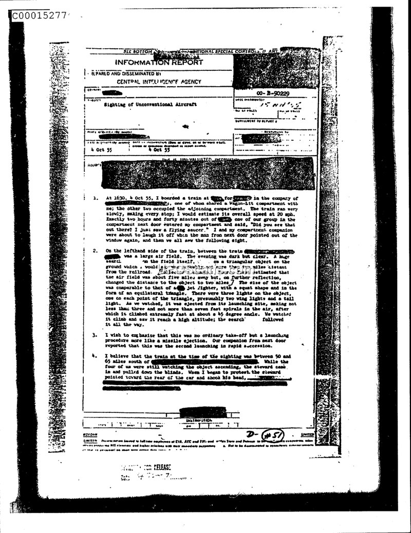A CIA information report detailing a 1955 sighting of a triangular, missile-like object performing a rapid, spiraling launch from the ground near a railroad line.
