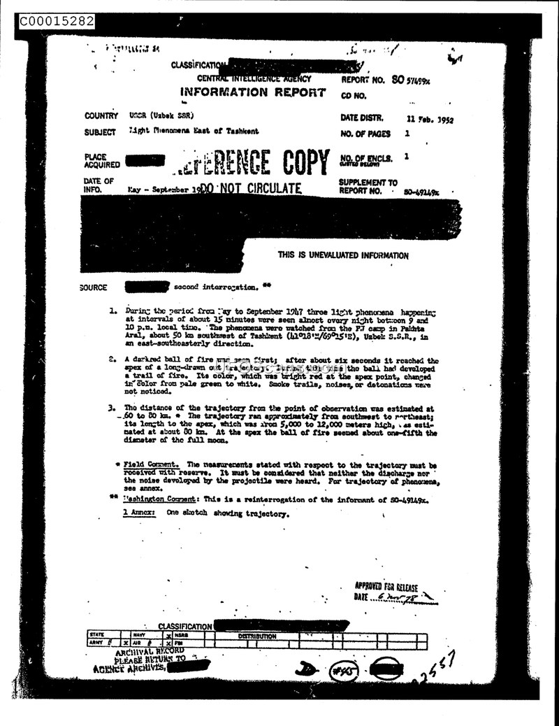This Central Intelligence Agency Information Report, dated February 11, 1952, details a series of aerial light phenomena observed in the Uzbek SSR between May and September 1947. The report is based on a second interrogation of an informant, who claimed that three distinct light phenomena occurred at approximately 15-minute intervals between 9:00 p.m. and 10:00 p.m. local time. The observations were made from the Palhta Aral camp, located approximately 50 kilometers southwest of Tashkent at coordinates 41°18'N/69°15'E. According to the source, the phenomena began as a dark ball of fire that, after six seconds, reached the apex of a long-drawn-out trajectory. During this ascent, the object developed a trail of fire and shifted in color from pale green to white, eventually appearing bright red at its apex. The observer noted that no smoke trails, noises, or detonations were associated with the objects. The trajectory was estimated to span 60 to 80 kilometers, moving from the southwest to the northeast, with an altitude estimated between 5,000 and 12,000 meters. At the apex of its flight, the object was described as being approximately one-fifth the diameter of the full moon. The document includes a significant field comment cautioning that the reported measurements regarding the trajectory should be treated with reserve, noting specifically that the lack of audible discharge or noise from the projectile is a point of consideration. The report also references a previous interrogation of the same informant (SO-49149x) and mentions an attached sketch of the trajectory.