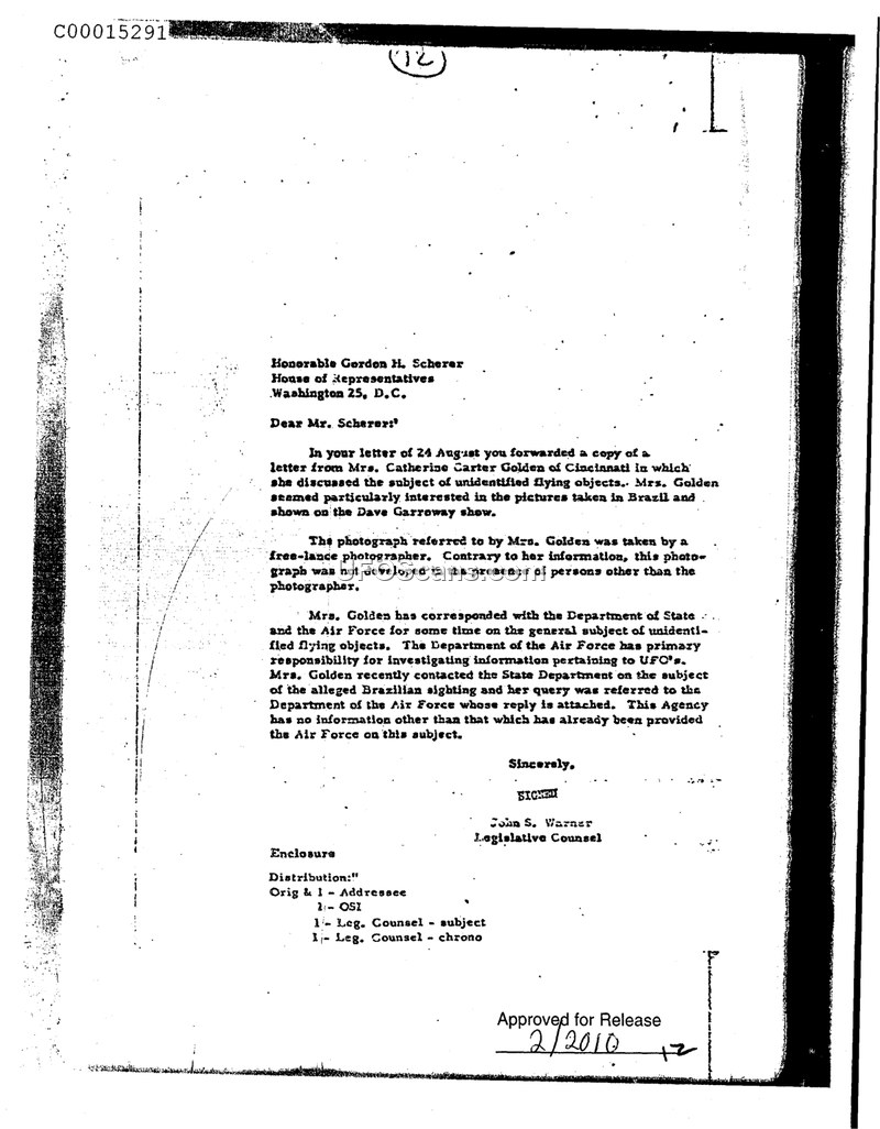 This document is a formal letter addressed to the Honorable Gordon H. Scherer of the House of Representatives from John S. Warner, Legislative Counsel. The letter serves as a response to an inquiry forwarded by Mr. Scherer on August 24 regarding a letter from Mrs. Catherine Carter Golden of Cincinnati. Mrs. Golden had expressed interest in unidentified flying objects, specifically referencing photographs taken in Brazil that were featured on the Dave Garroway show. The correspondence clarifies that the photographs in question were taken by a freelance photographer and were not developed in the presence of any other individuals. Furthermore, the letter notes that Mrs. Golden had been in contact with both the Department of State and the Department of the Air Force regarding UFOs. The author explains that the Department of the Air Force holds primary responsibility for investigating such reports and that the agency has no additional information beyond what has already been provided to the Air Force on this matter.