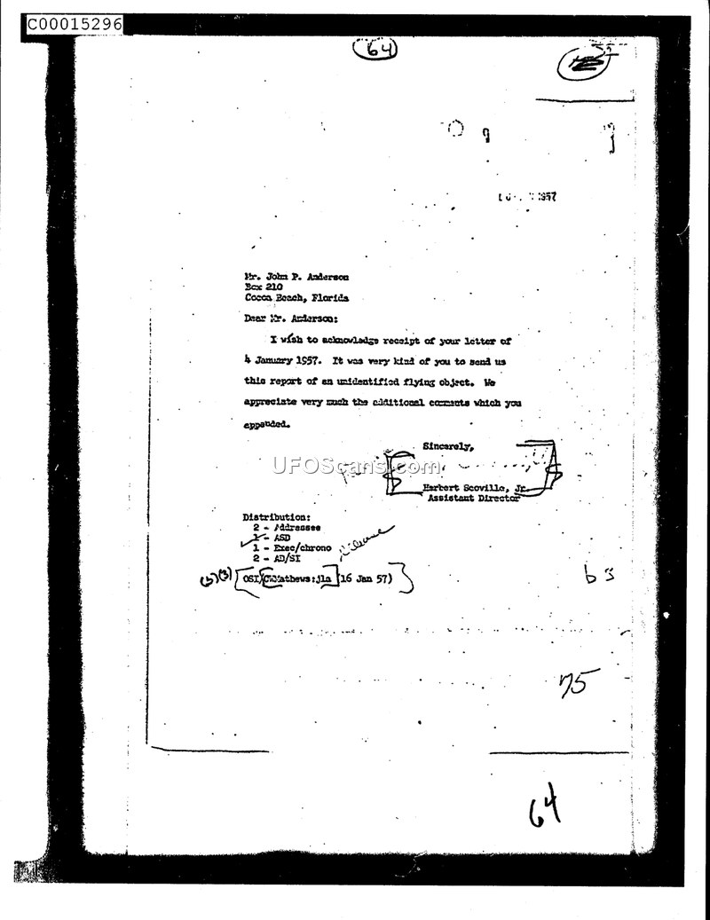 This is a 1957 letter from Assistant Director Herbert Scoville, Jr. acknowledging receipt of a UAP report submitted by a private citizen, John P. Anderson. It serves as a record of administrative correspondence regarding UFO reporting procedures.