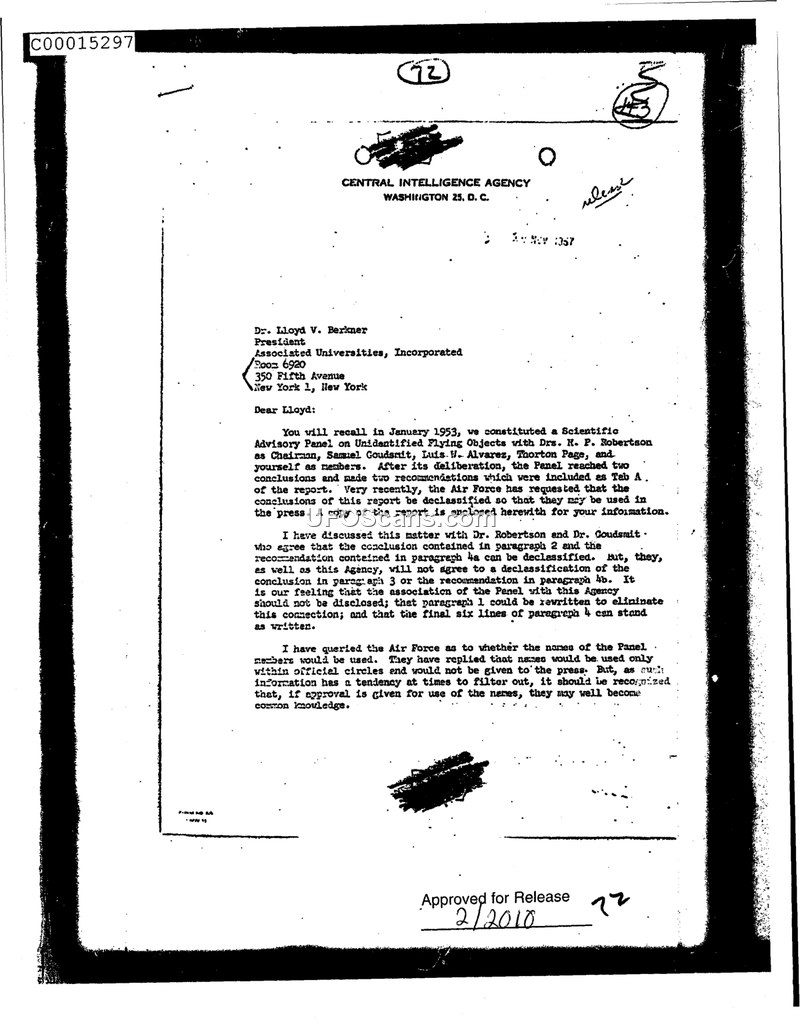 This document is a letter from the Central Intelligence Agency to Dr. Lloyd V. Berkner, dated November 5, 1957. The correspondence concerns the status of the report produced by the Scientific Advisory Panel on Unidentified Flying Objects, which was established in January 1953. The panel, chaired by Dr. H. P. Robertson and including members Samuel Goudsmit, Luis W. Alvarez, Thorton Page, and Dr. Berkner, had previously reached conclusions and recommendations regarding unidentified flying objects. The Air Force had recently requested that these findings be declassified for release to the press. The author of the letter notes that they consulted with Dr. Robertson and Dr. Goudsmit, who agreed that while the conclusion in paragraph 2 and the recommendation in paragraph 4a could be declassified, the conclusion in paragraph 3 and the recommendation in paragraph 4b should remain classified. The primary concern expressed by the Agency is the potential association between the Agency and the Panel, which they wish to avoid. The letter suggests that paragraph 1 could be rewritten to eliminate this connection and that the final six lines of paragraph 4 could stand as written. Furthermore, the author mentions querying the Air Force regarding the use of the panel members' names, to which the Air Force replied that names would only be used within official circles and not released to the press, though the author warns that such information has a tendency to filter out and could eventually become common knowledge.