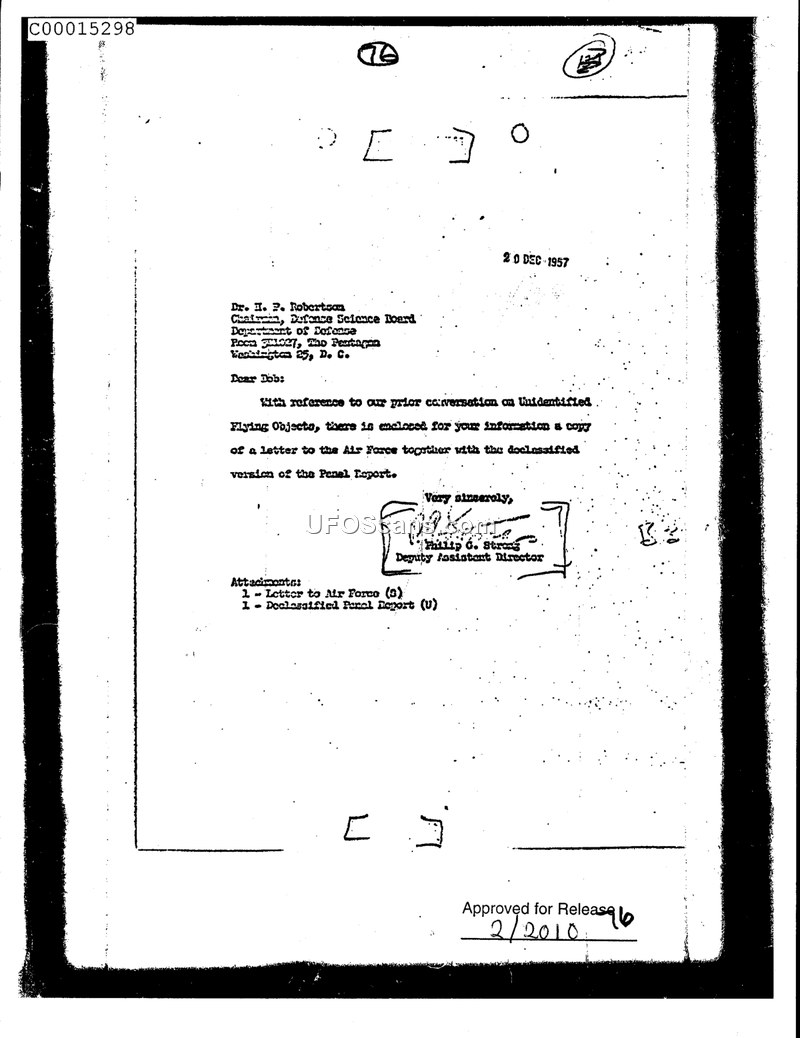 A 1957 letter from Philip G. Strong to Dr. H. P. Robertson transmitting a letter to the Air Force and a declassified Panel Report concerning Unidentified Flying Objects.