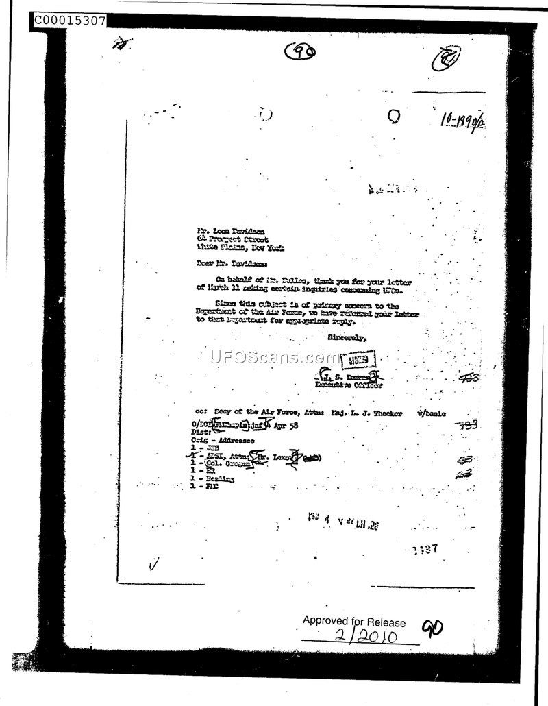 A 1958 letter from an executive officer to Leon Davidson acknowledging his inquiry about UFOs and stating that the matter has been referred to the Department of the Air Force.