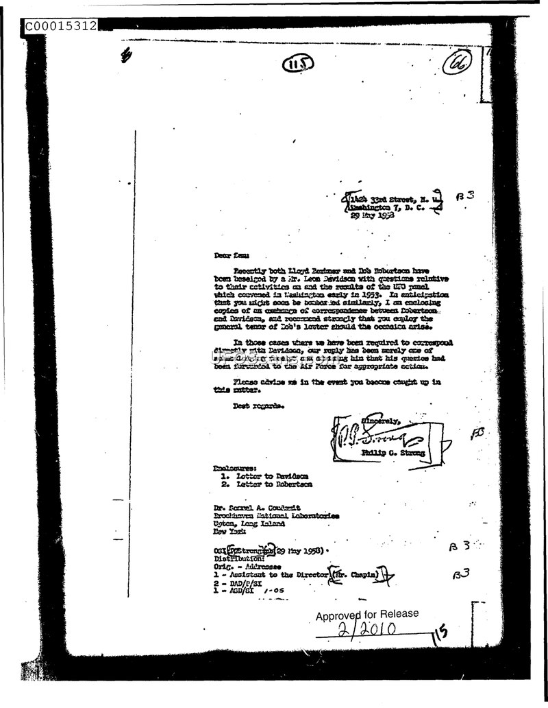 This letter, dated May 29, 1958, is addressed to Dr. Scovel A. Goudsmit at the Brookhaven National Laboratories. The author, Philip G. Strong, writes to inform Dr. Goudsmit about persistent inquiries from a Mr. Leon Davidson. According to the document, Mr. Davidson has been contacting Lloyd Berkner and Bob Robertson regarding their activities and the findings of a UFO panel that convened in Washington in early 1953. Strong expresses concern that the recipient may also be contacted by Davidson. He advises that if such contact occurs, the recipient should follow the established procedure of acknowledging receipt and informing Davidson that his queries have been forwarded to the Air Force for appropriate action. The letter includes two enclosures: a letter to Davidson and a letter to Robertson. The document also notes the distribution list, which includes the Assistant to the Director (Mr. Chapin), DAD/P/SI, and ASD/SI.