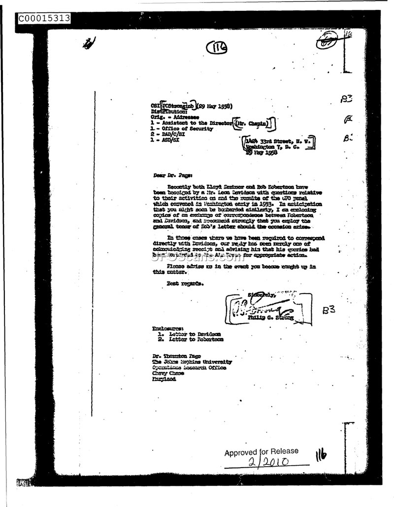 This correspondence, dated May 29, 1958, is authored by Philip G. Strong and addressed to Dr. Thornton Page at the Operations Research Office of The Johns Hopkins University. The document serves as an advisory regarding a Mr. Leon Davidson, who had been contacting Lloyd Berkner and Bob Robertson with questions concerning their involvement in a UFO panel that convened in Washington in 1953. Strong expresses concern that Dr. Page might be similarly approached by Davidson. To assist Dr. Page, Strong includes copies of correspondence exchanged between Robertson and Davidson, suggesting that Page adopt a similar approach if contacted. Strong instructs that in cases where they are required to respond, they should merely acknowledge receipt of the inquiry and inform the individual that their queries have been forwarded to the Air Force for appropriate action.