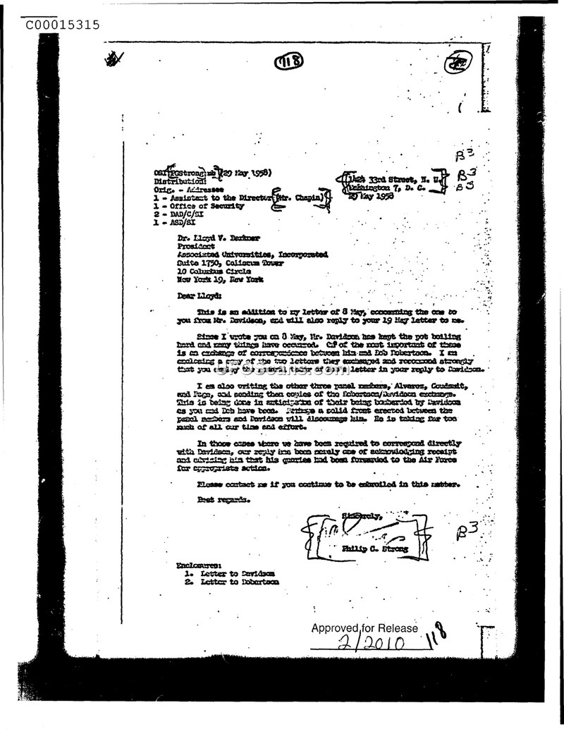 This memorandum, dated May 29, 1958, from Philip G. Strong of the OSI, is addressed to Dr. Lloyd V. Berkner, President of Associated Universities, Incorporated. The document serves as a follow-up to previous correspondence regarding an individual identified as Mr. Davidson. Strong informs Berkner that he is contacting the other three panel members—Alvarez, Coudsmit, and Page—to ensure a unified front in response to Davidson's persistent inquiries. Strong expresses concern that Davidson is consuming excessive time and effort. Consequently, the established procedure for future correspondence with Davidson will be to acknowledge receipt of his queries and inform him that they have been forwarded to the Air Force for appropriate action. The document includes two enclosures: a letter to Davidson and a letter to Robertson.
