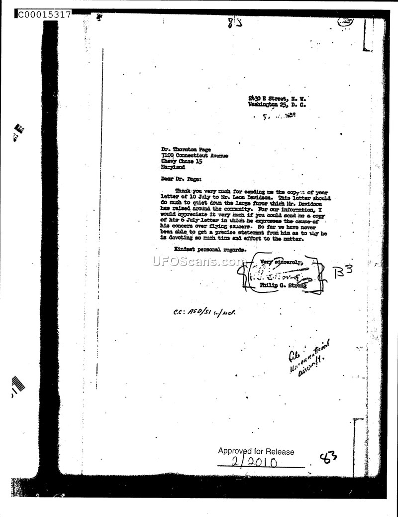 Philip G. Strong writes to Dr. Thornton Page to request a copy of a letter from Leon Davidson regarding his concerns about flying saucers. Strong notes that Davidson has caused a 'large furor' and that his specific concerns remain unclear.