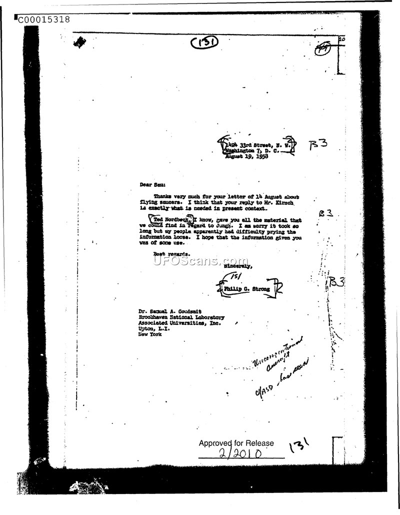 This document is a letter dated August 19, 1958, written by Philip G. Strong to Dr. Samuel A. Goudsmit at the Brookhaven National Laboratory. The correspondence acknowledges a previous letter from Dr. Goudsmit dated August 14 regarding the subject of 'flying saucers.' Strong expresses approval of a reply Dr. Goudsmit had prepared for a Mr. Kirsch, noting that it was appropriate for the context. Furthermore, Strong mentions that an individual named Ted Nordbeck had provided materials related to a person named Jungk. Strong apologizes for the delay in providing this information, citing difficulties his staff encountered in obtaining the necessary data. The document includes handwritten annotations at the bottom, which appear to read 'Unconventional Aircraft' and 'C/ASD has seen.'