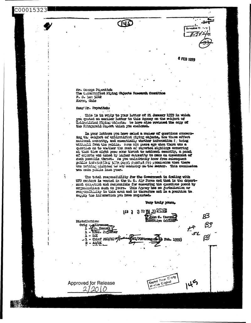 A 1959 letter from an agency official to the Unidentified Flying Objects Research Committee stating that the U.S. Air Force is the sole authority for UFO matters and that previous expert panels found no national security threat.