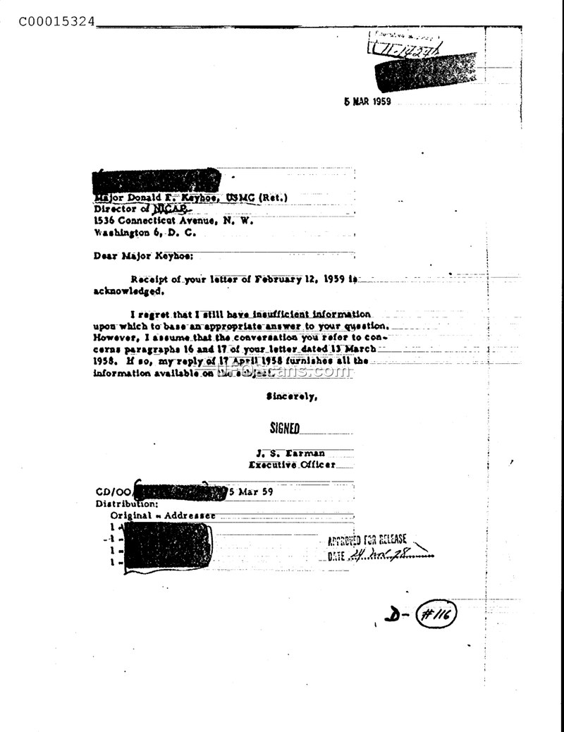 Correspondence from J. S. Earman to Major Donald E. Keyhoe, 5 March 1959