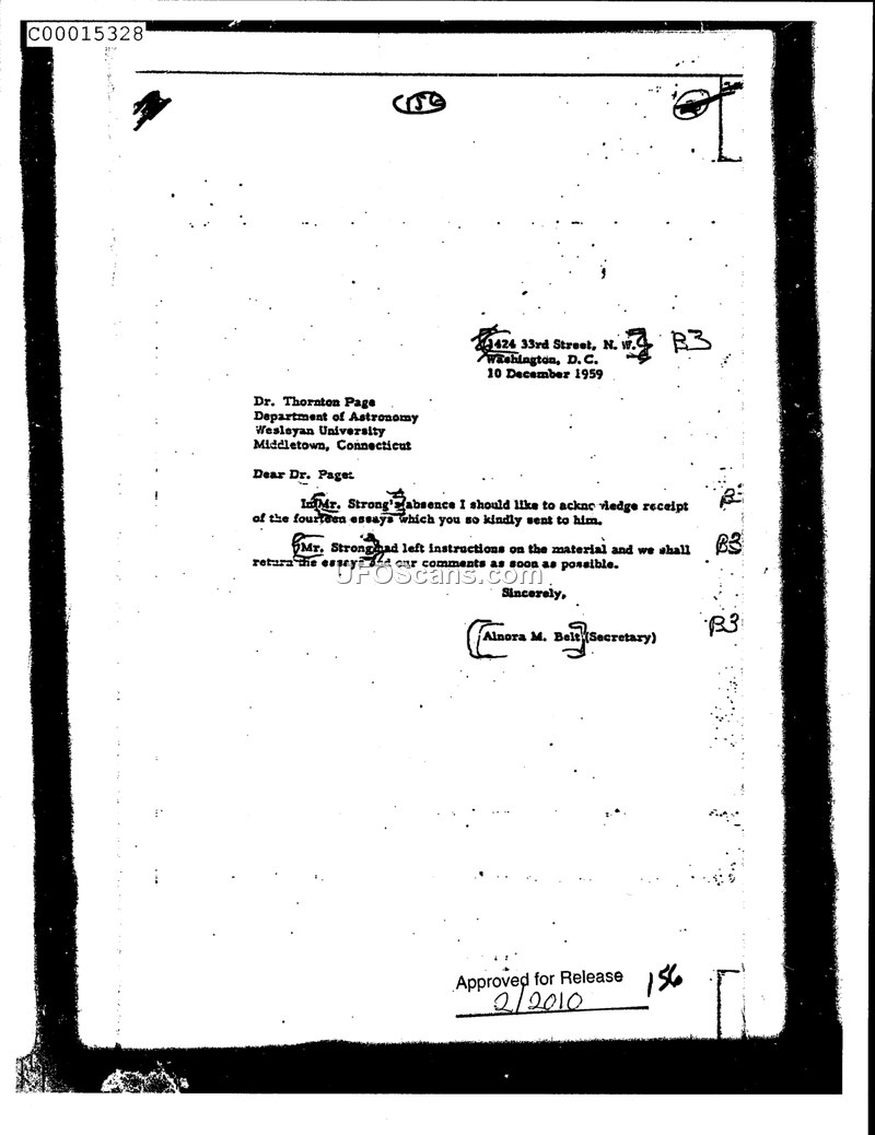 This document is a formal letter dated December 10, 1959, sent from an address in Washington, D.C., to Dr. Thornton Page at the Department of Astronomy, Wesleyan University, Middletown, Connecticut. The letter is signed by Alnora M. Belt, acting in the capacity of a secretary. The primary purpose of the correspondence is to acknowledge the receipt of fourteen essays that Dr. Page had previously sent to a Mr. Strong. The letter notes that Mr. Strong is currently absent and that he had left specific instructions regarding the handling of these materials. The author assures Dr. Page that the essays and any associated comments will be returned to him as soon as possible.