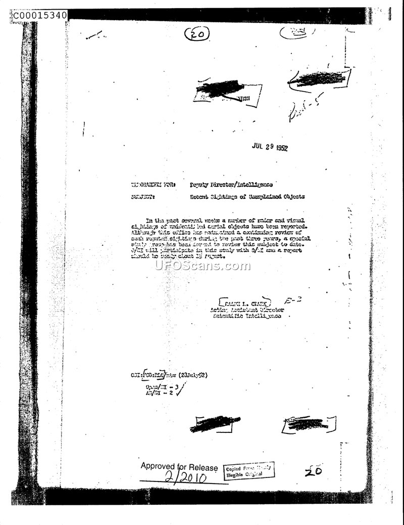 This memorandum, dated July 29, 1952, is addressed to the Deputy Director/Intelligence from Ralph L. Clark, the Acting Assistant Director of Scientific Intelligence. The document acknowledges that a significant number of radar and visual sightings of unidentified aerial objects have been reported in the preceding weeks. It notes that the office has maintained a continuing review of such sightings for the past three years. To address these recent developments, a special study group has been established to review the subject. The document states that the Office of Current Intelligence (O/CI) will participate in this study alongside the Office of Scientific Intelligence (O/SI), with a final report anticipated to be ready around mid-August.