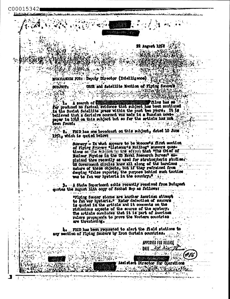 This memorandum, dated August 22, 1952, and addressed to the Deputy Director (Intelligence), provides an assessment of how the USSR and its satellite nations have addressed the subject of 'Flying Saucers' in their media. The author reports that a search of files yielded no factual evidence of the subject being mentioned in the Soviet Satellite press within the preceding two years. The document notes a belief that a derisive comment may have appeared in a Russian newspaper in 1948, but the specific article has not been located. The memorandum cites a June 10, 1951, broadcast which claimed that Moscow's first mention of flying saucers occurred in a 'Listener's Mailbag' segment, which alleged that the US Naval Research Bureau was using the objects for stratospheric studies and that the US government was using the reports to fan war hysteria. Furthermore, a State Department cable from Budapest, dated August 14, 1952, is cited, which reports that local media described flying saucer stories as American propaganda designed to prove that Western countries are under threat. The document concludes by noting that the relevant agency has been requested to alert field stations to monitor any further mentions of flying saucers by Iron Curtain countries.