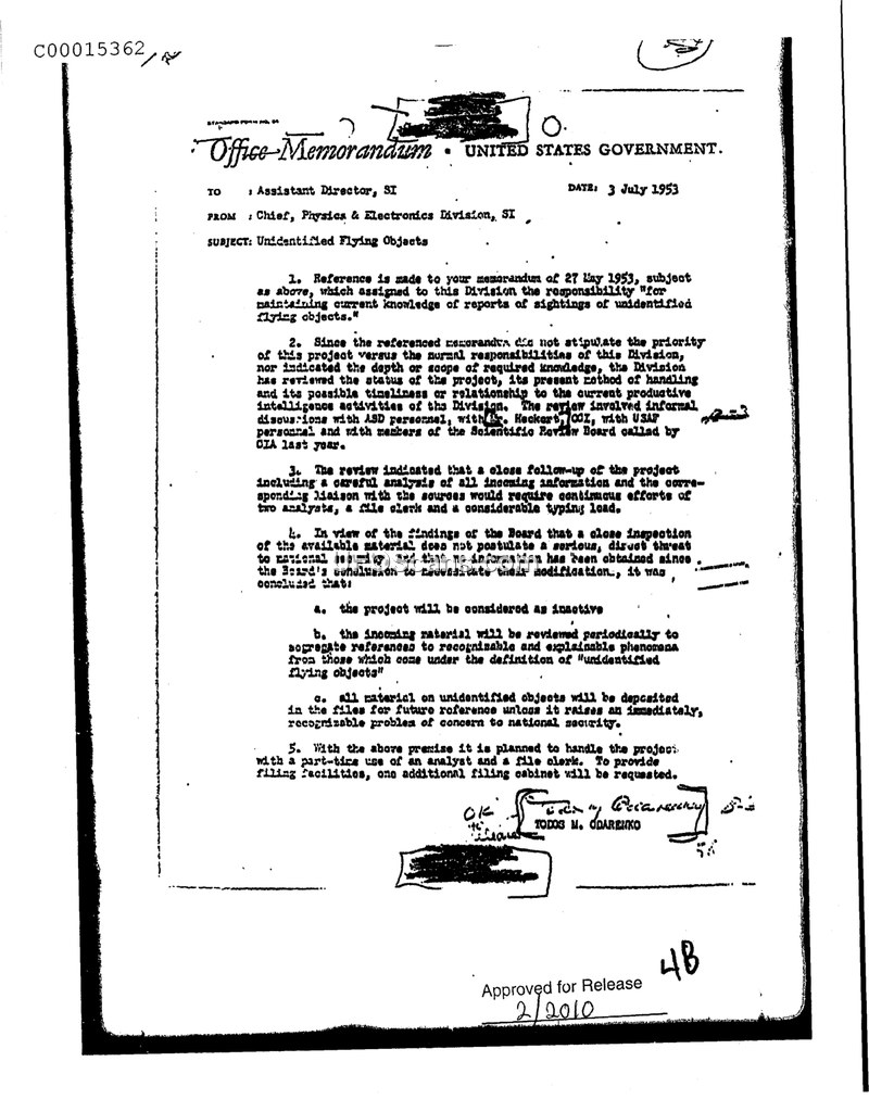 This memorandum, dated 3 July 1953, is addressed to the Assistant Director, SI, from the Chief of the Physics & Electronics Division, SI. It serves as a response to a previous directive from 27 May 1953, which had assigned the Division the responsibility of maintaining knowledge regarding reports of unidentified flying objects. The author reports that the Division conducted a review of the project's status, methods, and its relationship to current intelligence activities. This review included discussions with ASD personnel, OCI personnel (specifically Mr. Heckert), USAF personnel, and members of the Scientific Review Board that had been convened by the CIA the previous year. The Division concluded that a thorough follow-up of the project would require the continuous efforts of two analysts and a file clerk, representing a significant typing load. Furthermore, the Division determined that the available material did not indicate a serious, direct threat to national security, and that no new information had been obtained since the Scientific Review Board's findings to necessitate a change in that assessment. Consequently, the Division decided to classify the project as inactive. Moving forward, incoming material will be reviewed periodically to separate reports of unidentified flying objects from other phenomena, and all material will be deposited in files for future reference unless it presents an immediate, recognizable problem concerning national security. The project will be managed with part-time support from one analyst and one file clerk, and a request for one additional filing cabinet was made.