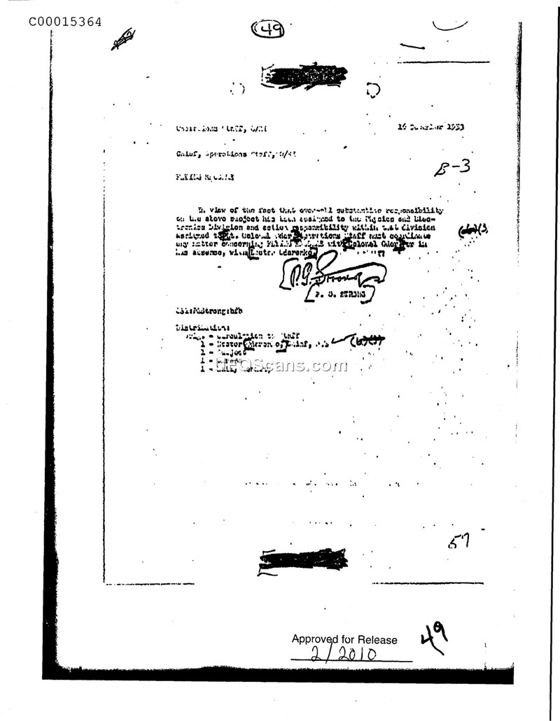 This memorandum, dated December 14, 1953, and originating from the Operations Staff, G/II, serves to formalize the assignment of responsibility for a specific, though redacted, subject matter. The document explicitly states that overall responsibility for this subject has been transferred to the Physics and Electronics Division. Furthermore, it mandates that the Operations Staff must coordinate any matters pertaining to this subject with a specific Colonel, or in his absence, with a Lieutenant whose name is partially illegible. The document includes a distribution list and bears a signature from P. G. Strong.