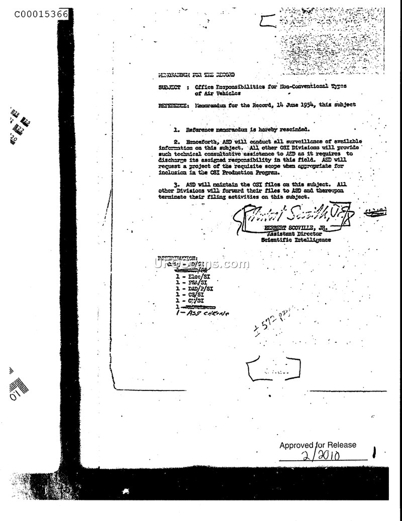 This Memorandum for the Record, issued by Herbert Scoville, Jr., Assistant Director of Scientific Intelligence, establishes new administrative responsibilities within the Office of Scientific Intelligence (OSI) regarding 'Non-Conventional Types of Air Vehicles.' The document explicitly rescinds a prior memorandum dated 14 June 1954. Under the new directive, the ASD division is tasked with conducting all surveillance of available information concerning this subject. Other OSI divisions are instructed to provide technical consultative assistance to ASD as required and to forward their existing files on the subject to ASD, effectively terminating their own independent filing activities on the matter. Furthermore, ASD is authorized to request a project for inclusion in the CSI Production Program when deemed appropriate. The document concludes with a distribution list indicating internal circulation among various OSI departments.