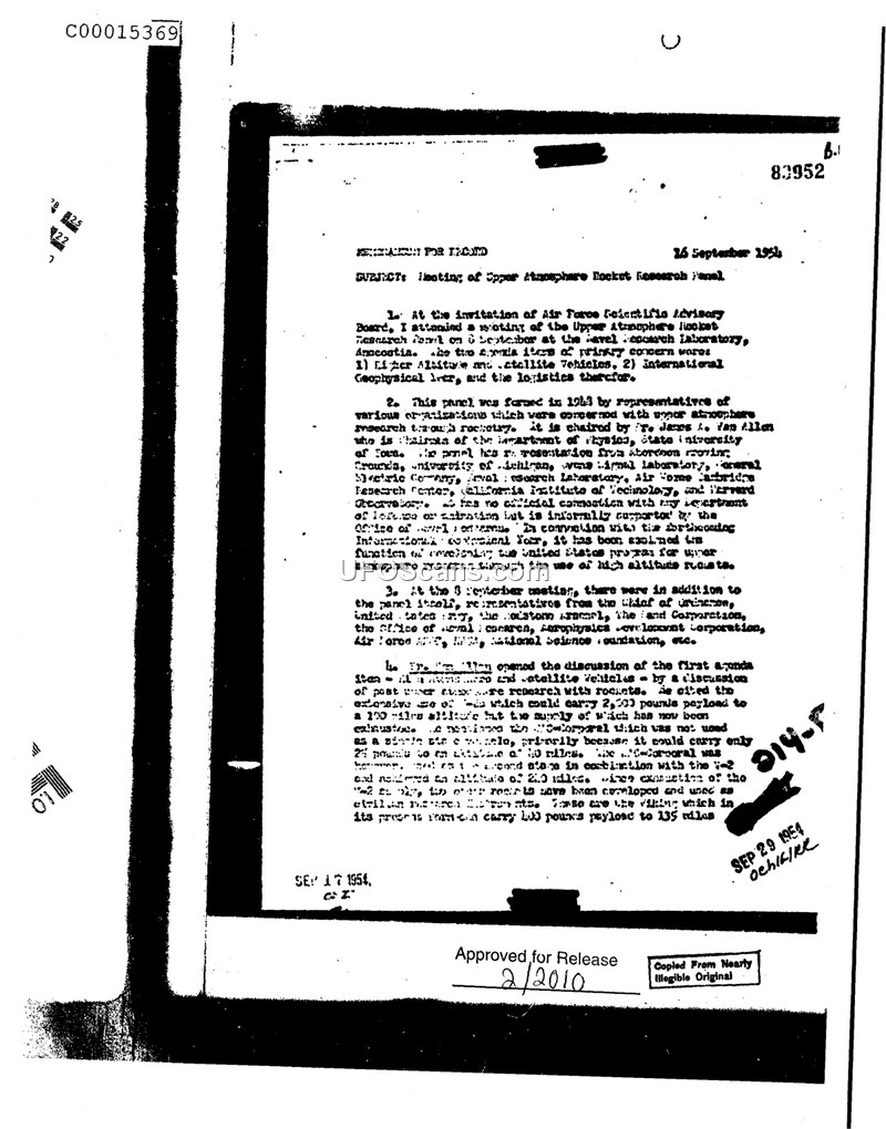 This Memorandum for Record, dated 16 September 1954, documents a meeting of the Upper Atmosphere Rocket Research Panel held on 8 September 1954 at the Naval Research Laboratory in Anacostia. The meeting was convened at the invitation of the Air Force Scientific Advisory Board. The primary agenda items focused on high altitude and satellite vehicles, as well as the logistics for the International Geophysical Year. The panel, which was formed in 1946, is chaired by Dr. James A. Van Allen of the State University of Iowa and includes representatives from various military and academic institutions, such as the Aberdeen Proving Grounds, the University of Michigan, the Signal Laboratory, the General Electric Company, the Air Force Cambridge Research Center, the California Institute of Technology, and the Harvard Observatory. The document notes that the panel has no official connection with any department of defense or agency, though it is informally supported by the Office of Naval Research. The meeting included attendees from the United States Army, the Office of Naval Research, the Aerophysics Development Corporation, the Air Force, NACA, and the National Science Foundation. Dr. Van Allen led a discussion on the history of rocket research, specifically detailing the performance of the V-2 rocket and the Viking rocket, noting their respective payload capacities and altitude achievements.