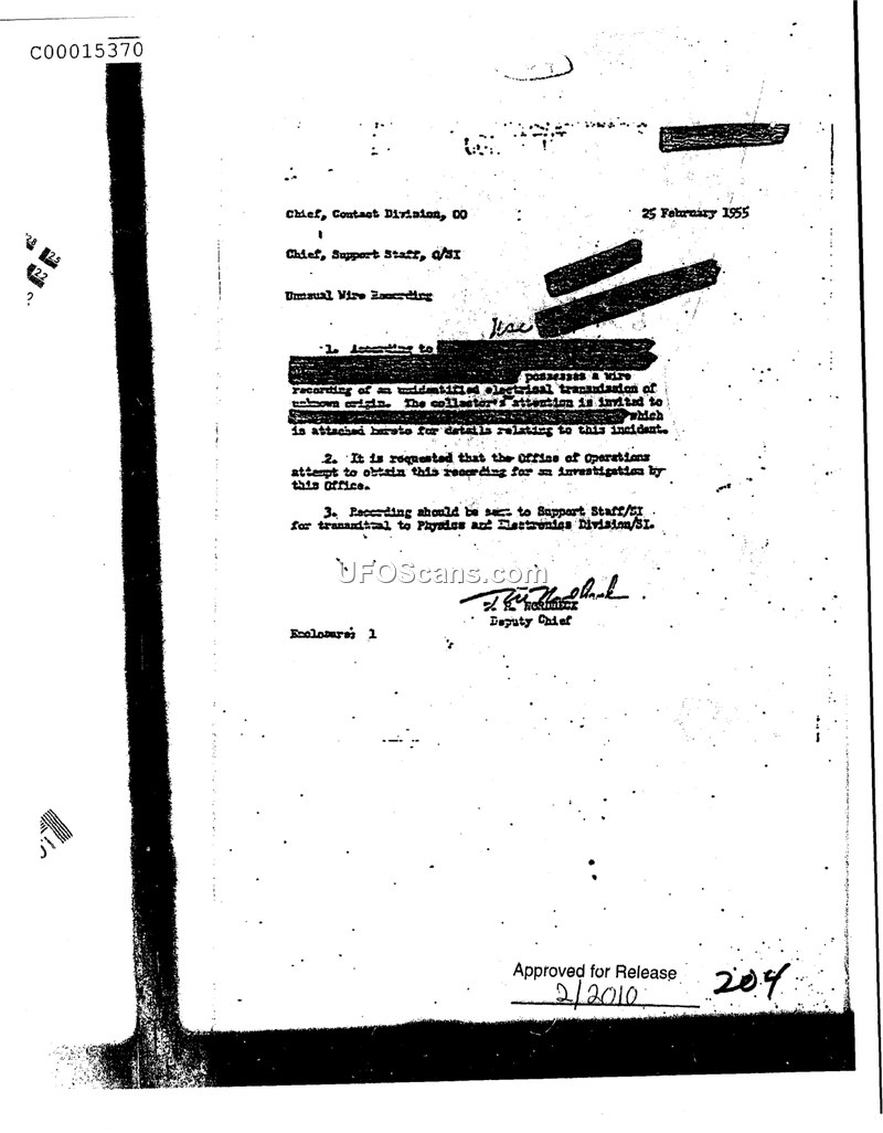 This memorandum, dated 25 February 1955, is addressed from the Deputy Chief, F. R. Nordheck, to the Chief of the Contact Division, OO. The subject of the correspondence is an 'Unusual Wire Recording.' The document notes that an unnamed entity possesses a wire recording of an unidentified electrical transmission of unknown origin. The author requests that the Office of Operations attempt to acquire this recording for investigation by the author's office. Furthermore, the memorandum directs that once obtained, the recording should be forwarded to the Support Staff/SI for eventual transmittal to the Physics and Electronics Division/SI. The document includes one enclosure, which presumably contains further details regarding the incident.
