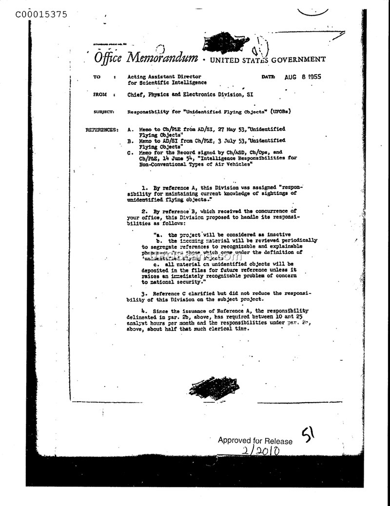 This office memorandum, dated August 8, 1955, from the Chief of the Physics and Electronics Division to the Acting Assistant Director for Scientific Intelligence, outlines the administrative status and responsibilities regarding Unidentified Flying Objects (UFOBs). The document references previous internal communications from 1953 and 1954 that established the Division's role in maintaining knowledge of such sightings. The memorandum clarifies that the project is currently considered inactive. The established procedure for handling incoming material involves periodic reviews to segregate recognizable and explainable phenomena from those that meet the definition of unidentified flying objects. Any material deemed to be of concern to national security is flagged, while other material is deposited into files for future reference. The document notes that since the issuance of the initial assignment, the project has required between 10 and 25 analyst hours per month, with approximately half that amount of time dedicated to clerical tasks. The memorandum serves to confirm that subsequent clarifications have not reduced the Division's responsibilities regarding this subject.