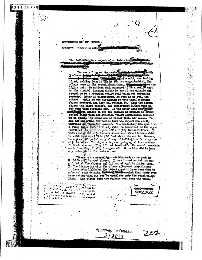 This memorandum for the record details an interview regarding a sighting of two unidentified objects. The primary witness, who was traveling on a train with three other individuals, reported observing a greenish-yellow, round object through a window. The object was described as ascending rapidly at a steep angle. A second object subsequently appeared, and the witness and his companions observed both. The witness noted that the objects did not produce any rocket trails or smoke, and he was unable to discern any specific details or outlines beyond the light itself. He described the movement as 'whirling or tumbling upward' along a trajectory that did not level off. The objects were estimated to be between 600 and 800 feet above the earth. The witness reported hearing no noise associated with the objects, despite the ambient noise of the train. A searchlight, similar to those used in World War II to spot planes, was visible in the vicinity, but it was not pointed at the objects and did not attempt to follow them. In a subsequent discussion, the other individuals claimed to have seen lights on the objects and suggested they were able to discern more details, though the primary witness maintained that he could only see the round, yellow light. The others stated that the objects passed over the train.
