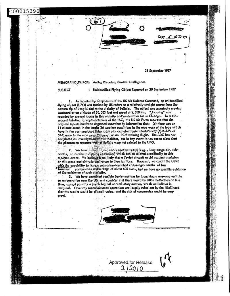 This memorandum, dated 21 September 1957, addresses a report of an Unidentified Flying Object (UFO) tracked by US Air Defense Command (ADC) radar on 20 September 1957. The object was observed moving on a relatively straight course from the eastern tip of Long Island toward the vicinity of Buffalo, traveling at an altitude of 50,000 feet and a speed of 2,000 knots. Reports of radar jamming were noted by several radars in the area extending as far west as Chicago. In a subsequent briefing for the Intelligence Advisory Committee (IAC), the US Air Force clarified that original reports had been degraded by three factors: an 11-minute break in the tracking, weather conditions known to produce false radar pips, and electronic interference caused by Strategic Air Command (SAC) B-47 aircraft conducting an ECM training flight near Chicago. While the ADC investigation remained ongoing at the time of the memo, it was concluded that phenomena reported west of Buffalo were unrelated to the UFO. The document further assesses the possibility of Soviet involvement, concluding there is no intelligence to support such a connection. It is deemed unlikely that a Soviet aircraft could achieve the reported speed and altitude while returning to Bloc territory. Furthermore, the agency finds little motivation for a one-way Soviet operation, noting that reconnaissance missions would be of marginal value and carry a high risk of compromise.