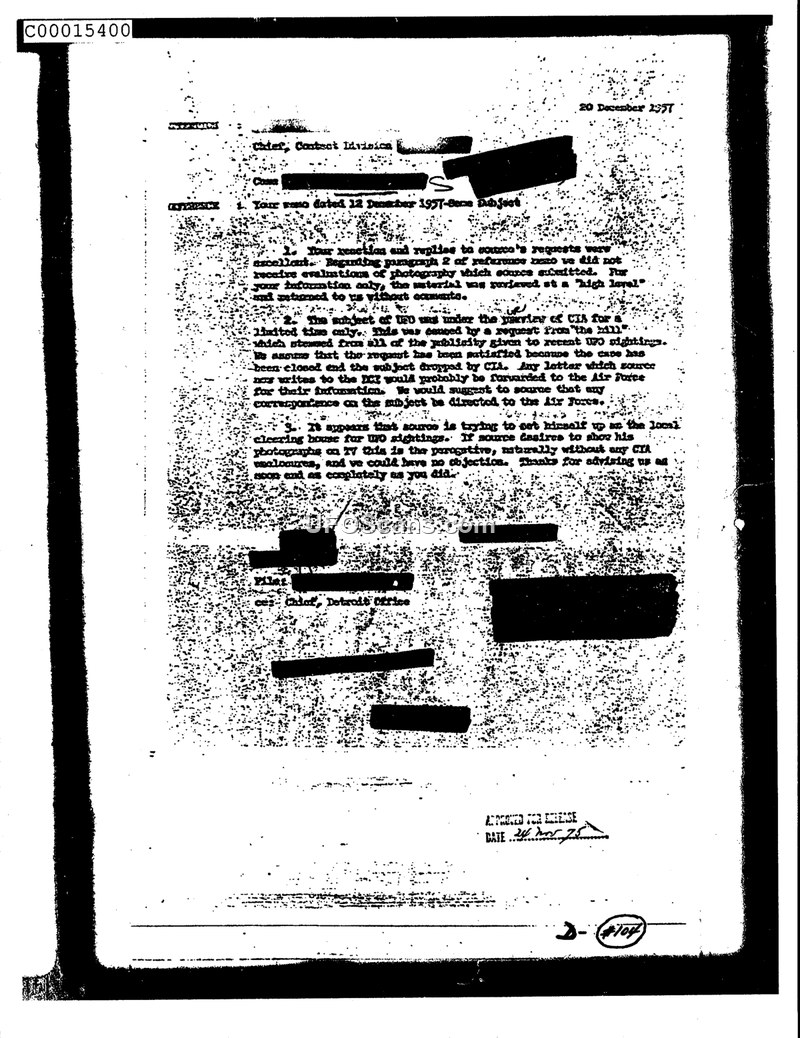 This memorandum, dated 20 December 1957, serves as a response to a previous communication regarding a source's inquiries into UFO sightings. The document clarifies the CIA's position on the subject, explicitly stating that the agency's involvement with UFOs was limited to a specific period, which has since concluded. The author notes that the CIA's previous interest was prompted by a request from 'the Hill' following public attention to recent sightings. The memorandum advises that the case is now closed and that any further correspondence from the source should be directed to the Air Force. Additionally, the author expresses concern that the source is attempting to position themselves as a local clearing house for UFO sightings. The document acknowledges that the source has submitted photographs for evaluation, which were reviewed at a high level and returned without comment. The CIA expresses no objection to the source displaying these photographs on television, provided it is done without any CIA enclosures.