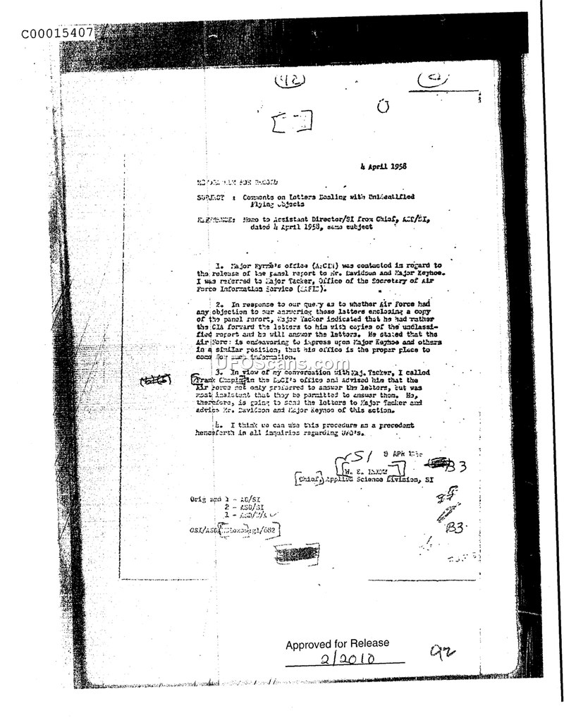 This memorandum, dated April 4, 1958, serves as a record regarding the handling of inquiries and requests for information about Unidentified Flying Objects (UFOs). The author, identified as the Chief of the Applied Science Division, SI, details the process of coordinating with the CIA and the Air Force regarding the release of a specific panel report to Mr. Davidson and Major Keyhoe. The author initially contacted Major Byrnes's office at the CIA, who referred them to Major Tacker at the Secretary of Air Force Information Service (SAFI). Major Tacker expressed a preference for the CIA to forward relevant letters to his office, as he believed the Air Force was the appropriate authority to address such inquiries and to manage communications with Major Keyhoe and others in similar positions. Following a conversation with Major Tacker, the author contacted Frank Chapin in the DCI's office to inform him that the Air Force was insistent on handling these responses directly. The memorandum concludes by establishing this referral process as a standard precedent for all future inquiries regarding UFOs.