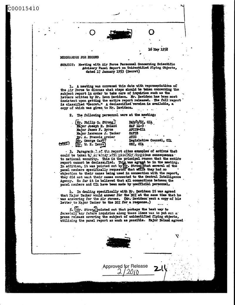 This Memorandum for Record, dated 16 May 1953, documents a meeting held between representatives of the Air Force and the Central Intelligence Agency (CIA). The primary purpose of the meeting was to determine the appropriate response to persistent inquiries from a Mr. Leon Davidson, who had been demanding the release of the full Scientific Advisory Panel Report on Unidentified Flying Objects, originally dated 17 January 1953. The document notes that while a declassified version of the report existed and had been provided to Mr. Davidson, he remained insistent on obtaining the full, classified version. Attendees at the meeting included representatives from various military and intelligence offices, including the CIA's Office of Scientific Intelligence (OSI) and the Air Technical Intelligence Center (ATIC). A significant portion of the discussion focused on the potential national security implications of the report's contents, specifically regarding actions an enemy might take. Mr. Strong of the CIA noted that several panel members had expressed a desire to avoid having their names publicly associated with the Central Intelligence Agency in connection with the report. To manage the ongoing correspondence with Mr. Davidson, it was agreed that Major Tacker would respond on behalf of the Director of Central Intelligence (DCI). Furthermore, the participants discussed the possibility of issuing a press release on the subject of unidentified flying objects as a strategic measure to mitigate further inquiries from the public.