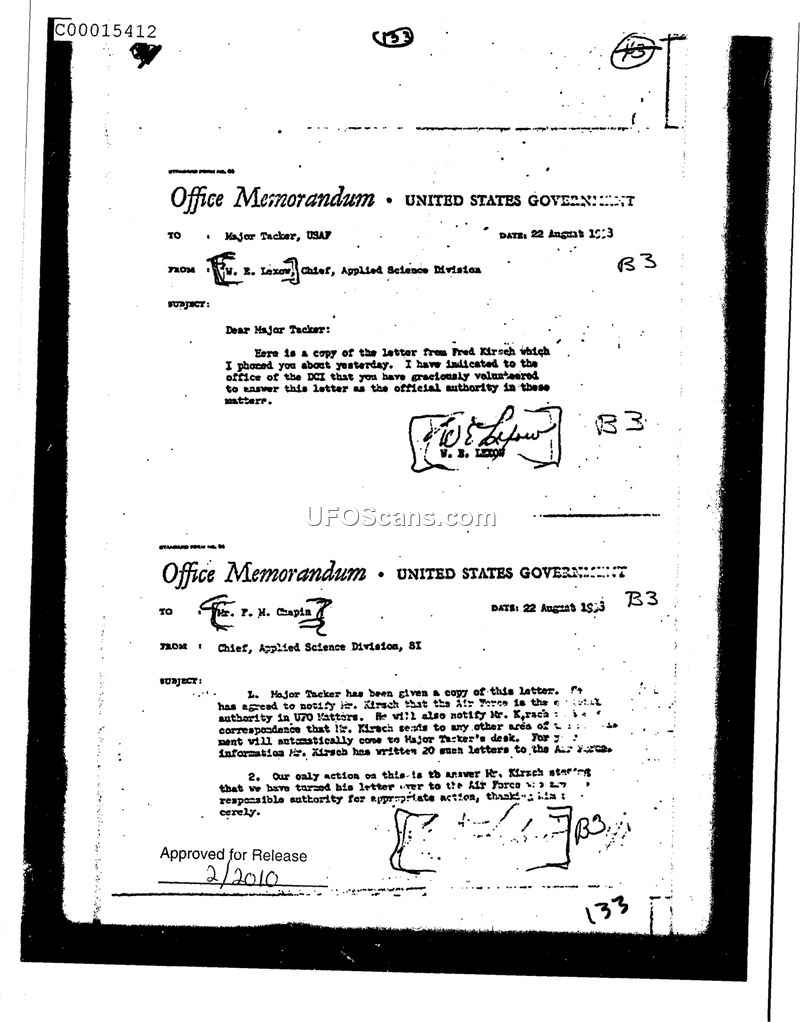 This document consists of two internal United States Government office memoranda, both dated August 22, 1953, originating from the Chief of the Applied Science Division. The primary purpose of these communications is to establish a protocol for handling correspondence received from an individual named Fred Kirsch. In the first memorandum, addressed to Major Tacker of the USAF, the author provides a copy of a letter from Mr. Kirsch and acknowledges Major Tacker's agreement to serve as the official authority for responding to such inquiries. The second memorandum, addressed to Mr. F. M. Chapin, formalizes this arrangement. It explicitly states that Major Tacker has been designated as the authority for UFO matters and that Mr. Kirsch should be notified accordingly. Furthermore, it instructs that any future correspondence from Mr. Kirsch sent to other areas of the government should be automatically forwarded to Major Tacker's desk. The document notes that Mr. Kirsch has already sent approximately 20 letters to the Air Force. The final action taken by the Applied Science Division is to inform Mr. Kirsch that his correspondence has been referred to the Air Force as the responsible authority for appropriate action.