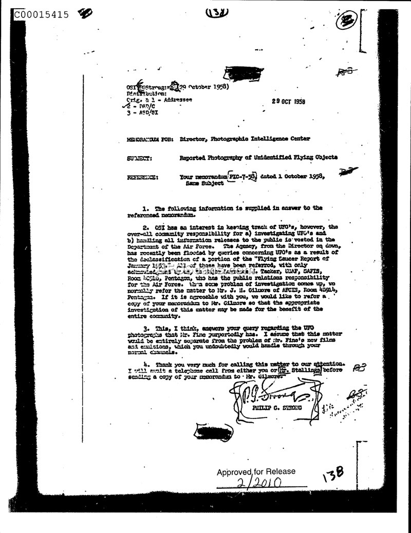 This memorandum, dated October 29, 1958, was authored by Philip G. Strong of the OSI and addressed to the Director of the Photographic Intelligence Center. The document serves as a formal response to a previous memorandum (PIC-7-58) regarding the handling of reported UFO photography. Strong clarifies the organizational responsibilities concerning Unidentified Flying Objects, explicitly stating that the Department of the Air Force holds the primary authority for investigating UFO sightings and managing public information releases. The author notes that the Agency had been receiving a high volume of inquiries following the 'Flying Saucer Report of January 1953.' Strong advises the recipient that public relations matters regarding UFOs should be directed to Major Lawrence J. Tacker (USAF, SAFIS) or Mr. J. H. Gilmore (AFCEI) at the Pentagon. Furthermore, the document distinguishes between the general UFO photography inquiry and a separate matter involving 'Mr. Fine's new films,' which the author suggests should be handled through normal channels. The memorandum concludes with a request for a telephone call from the recipient or a Mr. Stallings before any further action is taken regarding the distribution of the referenced memorandum.