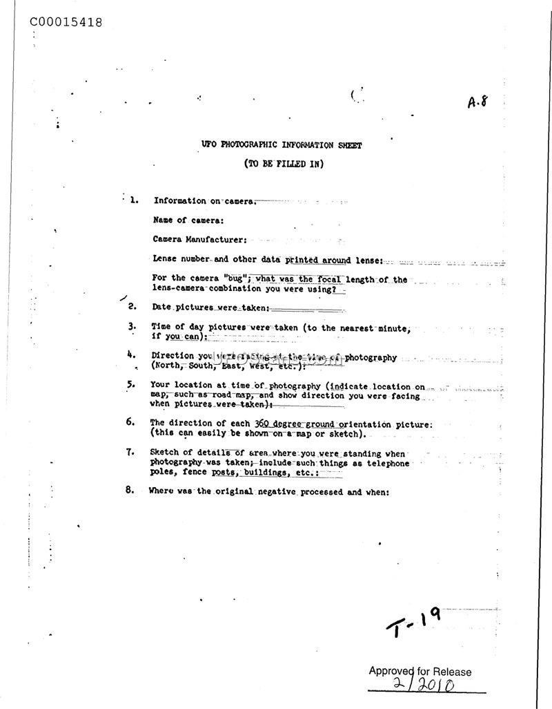 This document is a blank 'UFO Photographic Information Sheet' designed to be filled out by individuals who have captured photographic evidence of a UFO. The form requests specific technical and environmental data to assist in the analysis of such imagery. The requested information includes details about the camera used, such as the manufacturer, lens number, and focal length. It also asks for the date and time of the photography, the direction the photographer was facing, and the specific location of the photographer, including a request for a map or sketch. Furthermore, the form asks for a 360-degree ground orientation picture, a sketch of the surrounding area including landmarks like telephone poles or buildings, and information regarding where and when the original negative was processed. The document is marked with the reference number C00015418 and bears a stamp indicating it was approved for release in February 2010.