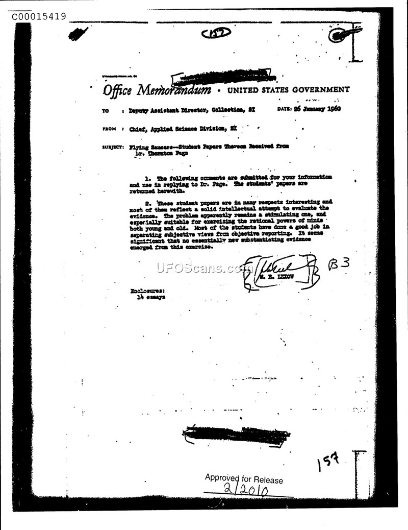 This memorandum, dated January 26, 1960, from the Chief of the Applied Science Division to the Deputy Assistant Director of Collection, concerns a collection of student papers regarding 'flying saucers' provided by Dr. Thornton Page. The author notes that the papers are interesting and reflect a commendable intellectual effort by the students to evaluate evidence. The memorandum highlights that the exercise was particularly useful for training students in the rational process of separating subjective viewpoints from objective reporting. Ultimately, the author concludes that the review of these fourteen essays yielded no new, substantiating evidence regarding the subject of flying saucers. The papers were returned to Dr. Page along with these comments.