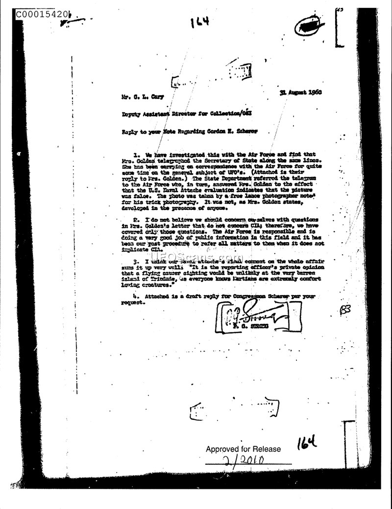 This memorandum, dated August 31, 1960, is addressed to Mr. C. L. Cary, the Deputy Assistant Director for Collection/OSI, from F. G. Strong. The document serves as a response to a note regarding Congressman Gordon H. Scherer. The primary subject is the investigation of correspondence initiated by a Mrs. Golden, who had contacted the Secretary of State regarding UFOs. The CIA investigated the matter with the Air Force and determined that Mrs. Golden had been in contact with the Air Force for some time. The State Department had referred her telegram to the Air Force, which evaluated her claims. Specifically, the Air Force determined that a photograph submitted by Mrs. Golden was the product of trick photography by a free-lance photographer known for such work, rather than a genuine sighting. The author of the memorandum asserts that the CIA should not concern itself with matters that do not directly involve the agency, noting that the Air Force is responsible for public information in this field and that it is standard procedure to refer such matters to them. The document concludes by referencing a comment from the Naval Attache regarding the island of Trindade, where a sighting was allegedly reported, suggesting that such a sighting would be unlikely on the barren island because 'Martians are extremely comfort loving creatures.' Finally, the memorandum notes that a draft reply for Congressman Scherer is attached for the recipient's review.