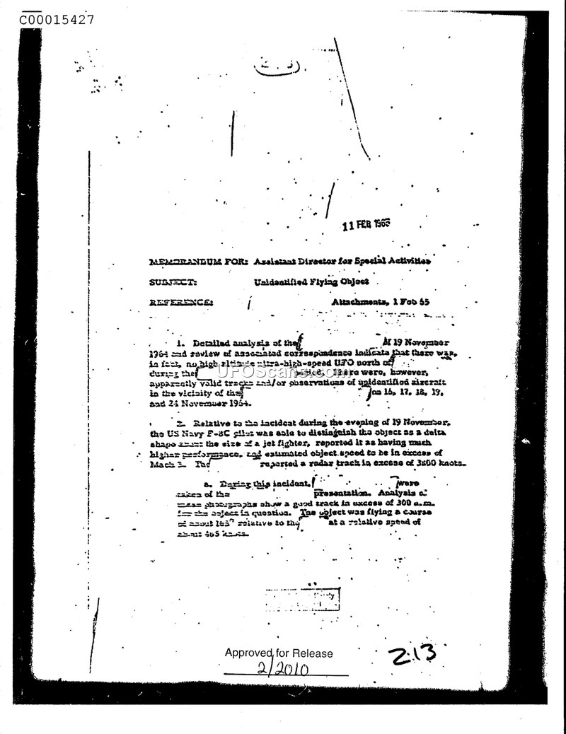 This memorandum, dated February 11, 1965, is addressed to the Assistant Director for Special Activities regarding Unidentified Flying Objects. The document summarizes findings from a detailed analysis of events occurring in November 1964. It confirms that there was a high-altitude, high-speed UFO observed north of a specific, though redacted, location. The report highlights that there were valid radar tracks and visual observations of unidentified aircraft on November 15, 17, 18, 19, and 24, 1964. Specifically, regarding the incident on the evening of November 19, 1964, a US Navy F-8C pilot reported observing an object with a delta shape, comparable in size to a jet fighter but possessing significantly higher performance capabilities. The pilot estimated the object's speed to be in excess of Mach 1, while radar data indicated a track exceeding 3500 knots. The document also references photographic evidence taken during the incident, which showed a track in excess of 300 nautical miles, with the object flying a course at a relative speed of approximately 465 knots.