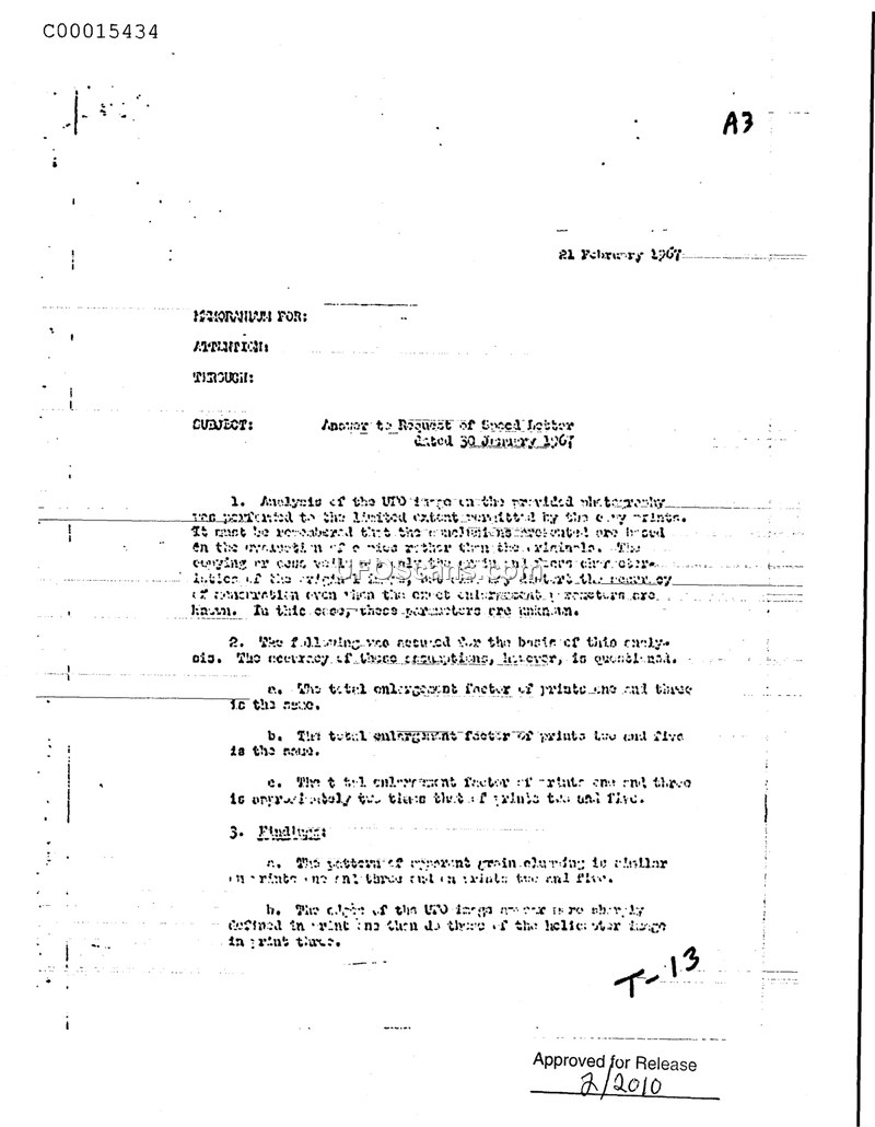 This memorandum, dated 21 February 1967, serves as a formal response to a request for information regarding a 'Speed Letter' dated 30 January 1967. The document details an analysis performed on photographic prints of a UFO. The author emphasizes that the analysis was constrained by the limited quality of the provided prints, noting that the conclusions drawn are based on copies rather than original negatives. The author warns that the copying process may have introduced distortions, and explicitly states that the accuracy of the assumptions used in the analysis is questionable. The document provides specific technical observations regarding the enlargement factors of the prints, noting that the total enlargement factor for prints one and three is the same, as is the factor for prints two and five. Furthermore, it is noted that the enlargement factor for prints one and three is approximately two times that of prints two and five. Regarding the findings, the author observes that the pattern of apparent grain clumping is similar in prints one and three compared to prints two and five, and that the edges of the UFO image appear more sharply defined in print one than in print three. The document concludes with a disclaimer regarding the reliability of these findings due to the nature of the source material.