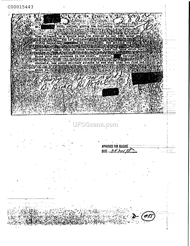 An individual from the FBID reported on a sports magazine published in Vienna called 'Der Flieger', which contained an article about flying objects. The article was reportedly sourced from a local Vienna newspaper. The individual named Boone expressed skepticism regarding the story's credibility, but the matter was referred to the Military Attache for further investigation.