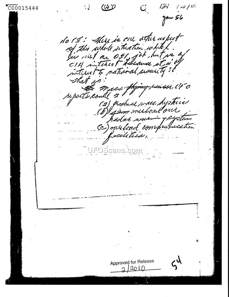 A 1956 CIA note identifies that mass reports of flying saucers are a national security concern due to risks of public hysteria, radar interference, and communication system overload.