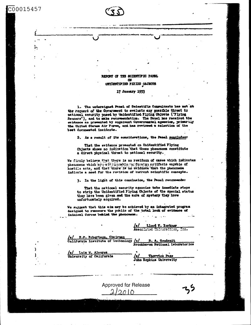 On January 17, 1953, a Scientific Panel on Unidentified Flying Objects issued a report following a request from the United States government to evaluate potential national security threats posed by 'Flying Saucers.' The panel, consisting of consultants including R.P. Robertson (Chairman), Lloyd V. Berkner, S. A. Goudsmit, Luis W. Alvarez, and Thornton Page, reviewed evidence provided by cognizant government agencies, primarily the United States Air Force, focusing on the best-documented incidents. The panel concluded that the evidence did not indicate that these phenomena posed a direct physical threat to national security. Furthermore, the panel stated their belief that there was no residue of cases indicating phenomena attributable to foreign artifacts capable of hostile acts, nor was there evidence suggesting a need to revise current scientific concepts. Consequently, the panel recommended that national security agencies take immediate steps to remove the 'special status' previously afforded to UFOs and the 'aura of mystery' surrounding them. They suggested that this objective be achieved through an integrated program designed to reassure the public regarding the total lack of evidence for inimical forces behind the phenomena.
