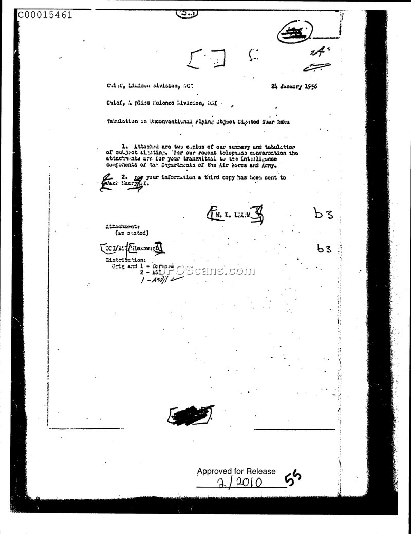 This memorandum, dated 24 January 1956, is addressed from the Chief of the Applied Science Division to the Chief of the Liaison Division. The document concerns the transmittal of two copies of a summary and tabulation regarding an unconventional flying object sighting that occurred near Haku. The author, W. E. Lexow, notes that these documents are being provided for transmittal to intelligence components within the Department of the Air Force and the Department of the Army. Additionally, the memorandum confirms that a third copy of the materials has been sent to an individual identified as Jack [illegible].