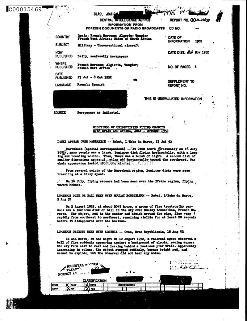 This CIA intelligence report summarizes multiple UFO sightings in North Africa and Spain during the summer of 1952. It documents specific witness accounts of luminous disks and aerial fireballs.