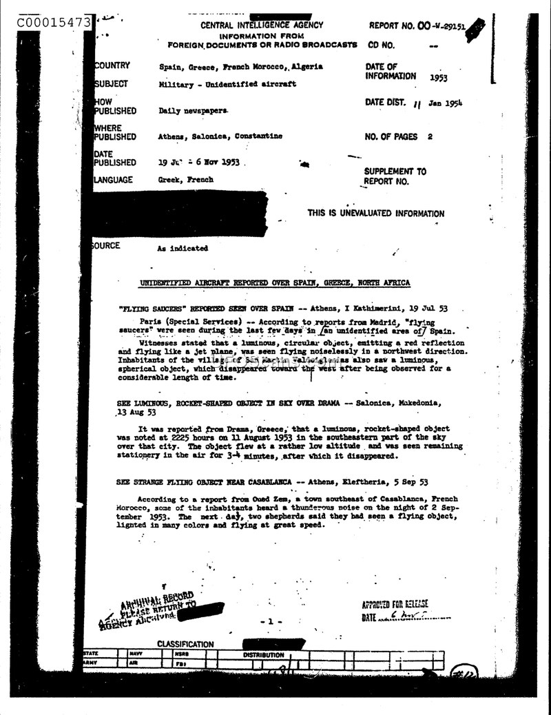 This Central Intelligence Agency report, dated January 11, 1954, provides a summary of unidentified aircraft sightings reported in daily newspapers across Spain, Greece, and French Morocco during 1953. The document explicitly states that the information provided is unevaluated. The first report, sourced from the Athens newspaper 'I Kathimerini' on July 19, 1953, describes 'flying saucers' seen in Spain. Witnesses in the village of San Martin Valdeiglesias reported a luminous, spherical object that emitted a red reflection and flew noiselessly in a northwest direction before disappearing toward the west. A second report, from the Salonica newspaper 'Makedonia' on August 13, 1953, details an incident in Drama, Greece. On August 11, 1953, at 2225 hours, a luminous, rocket-shaped object was observed at a low altitude. It remained stationary in the air for three to four minutes before disappearing. The final report, from the Athens newspaper 'Eleftheria' on September 5, 1953, concerns an event near Oued Zem, a town southeast of Casablanca, French Morocco. On the night of September 2, 1953, inhabitants reported hearing a thunderous noise. The following day, two shepherds claimed to have seen a flying object that was lit in many colors and traveling at great speed.